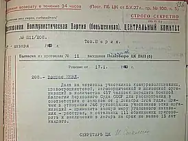 The Secretariat headed the CPSU's central apparatus and was solely responsible for the development and implementation of party policies.[106] It was legally empowered to take over the duties and functions of the Central Committee when it was not in the plenum (did not hold a meeting).[106] Many members of the Secretariat concurrently held a seat in the Politburo.[107] According to a Soviet textbook on party procedures, the Secretariat's role was that of "leadership of current work, chiefly in the realm of personnel selection and in the organization of the verification of fulfillment of party-state decisions".[107] "Selections of personnel" (Russian: podbor kadrov) in this instance meant the maintenance of general standards and the criteria for selecting various personnel. "Verification of fulfillment" (Russian: proverka ispolneniia) of party and state decisions meant that the Secretariat instructed other bodies.[108]