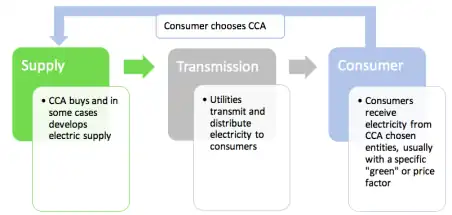 Community Choice Aggregation (CCA), also known as Community Choice Energy, municipal aggregation, governmental aggregation, electricity aggregation, and community aggregation, is an alternative to the investor owned utility energy supply system in which local entities in the United States aggregate the buying power of individual customers within a defined jurisdiction in order to secure alternative energy supply contracts.[1] The CCA chooses the power generation source on behalf of the consumers.