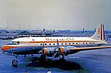 By March 1960, the airline had a fleet of eight DC-3s, four DC-4s and four Faucett Stinson F-19s to serve a route network that was 6,368 miles (10,248 km) long.[9] A second-hand Douglas DC-6B acquired from Panagra was incorporated into the fleet in the early 1960s.[5][10] Another DC-6B was acquired in late 1964, and was converted to DC-6B(F) standard with a large rear freight door.[11] This was operated on cargo services to Miami, Florida.
