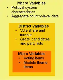 CSES datasets contain variables at three levels. The first is micro-level variables which are answered by respondents during post-election surveys in each included country. The second is district-level variables that contain election results from the electoral districts that survey respondents are situated in. The third is macro-level variables containing information about the country context and electoral system, as well as aggregate data such as economic indicators and democracy indices. This nested data structure, as depicted in Figure 1, allows for multilevel analysis.