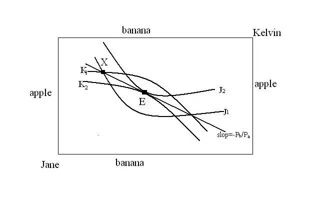 1. Graphical example: Suppose that the initial allocation is at point X, where Jane has more apples than Kelvin does and Kelvin has more bananas than Jane does.