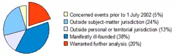 - 13% concerned crimes that were "manifestly outside the personal or territorial jurisdiction of the Court". The Court can generally only prosecute crimes committed on the territory of, or by nationals of, states parties, and crimes referred by the United Nations Security Council.