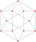 This complex polygon has 8 edges (complex lines), labeled as a..h, and 16 vertices. Four vertices lie in each edge and two edges intersect at each vertex. In the left image, the outlined squares are not elements of the polytope but are included merely to help identify vertices lying in the same complex line. The octagonal perimeter of the left image is not an element of the polytope, but it is a petrie polygon.[3] In the middle image, each edge is represented as a real line and the four vertices in each line can be more clearly seen.