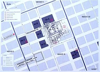 15 decumani and 16 cardines were traced, occupying an approximate area of 48 hectares that housed 10,000 to 15,000 inhabitants in its heyday before the crisis of the 3rd century. The two main avenues, the Cardo Máximus and the Decumanus Máximus, intersected at the Forum with the commercial areas, the main public and religious buildings. and the houses of the most important citizens.[8]