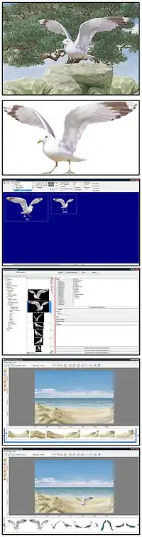 When starting a new project CAM software requests a user to fill in measurements, these will usually be of the wall which the frescography is later mounted to. Once the project has been created the user may choose from a library of images which are categorized into themes and motives. The library will either be filled with content by the user himself, or the user can purchase a CAM software which is already filled by the manufacturer, the Dreamworlds Design Studio.[2] The user creates designs by placing the motifs on the workspace. By giving the motifs layer attributes, it is possible to put image elements such as skies or oceans in the background and a beach or vegetation in the foreground. With additional options such as re-sizing and cropping individual motifs, a design gains depth and realistic proportions.