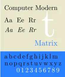 Computer Modern is the original family of typefaces used by the typesetting program TeX. It was created by Donald Knuth with his Metafont program, and was most recently updated in 1992.[1] Computer Modern, or variants of it, remains very widely used in scientific publishing, especially in disciplines that make frequent use of mathematical notation.