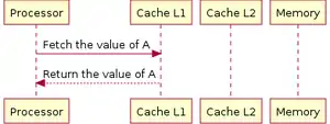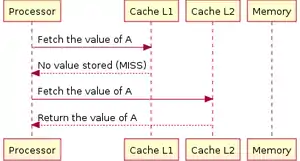 When the data is not where the processor is looking for, it is called a cache-miss. Below, pictures show how the processor fetch data when there are two cache levels.