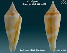 - Conasprella elegans elegans (G. B. Sowerby III, 1895) (synonym: Conus elegans elegans G. B. Sowerby III, 1895)