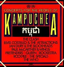 Concerts for the People of Kampuchea is a double album credited to Various Artists and released in March 1981.[3] It contains live performances by Wings, the Who, Queen, Elvis Costello, Pretenders, the Clash, the Specials and other artists from the Concerts for the People of Kampuchea, held at London's Hammersmith Odeon in December 1979 to raise money for the victims of war-torn Cambodia.
