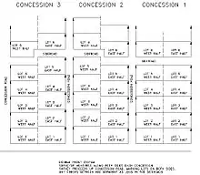 In Upper and Lower Canada, concession roads were laid out by the colonial government through undeveloped Crown land to provide access to rows of newly surveyed lots intended for farming by new settlers. The land that comprised a row of lots that spanned the entire length of a new township was "conceded" by the Crown for this purpose (hence, a "concession of land"). Title to an unoccupied lot was awarded to an applicant in exchange for raising a house, performing roadwork and land clearance, and monetary payment.[1] Concession roads and cross-cutting sidelines or sideroads were laid out in an orthogonal (rectangular or square) grid plan, often aligned so that concession roads ran (approximately) parallel to the north shore of Lake Ontario, or to the southern boundary line of a county.