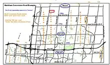 By one count, there were five major Ontario survey systems, with 166 variations, resulting in a "crazy quilt" of surveys.[3] In many cases special colonization roads ran diagonally across the grid. Survey lines referenced back from the Great Lakes ran at different angles, forming triangles and other irregular shapes. Some townships had more than one survey. Holland,[5] Nelson[6] and Toronto Township (today Mississauga) are examples.