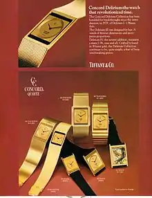 In 1970, Concord was purchased by the North American Watch Company. While the company struggled initially, it transitioned into a luxury quartz watch company, and during the quartz crisis it attained a large market share despite other competitors like Rolex.[4] Throughout the 1980s, Concord watches became some of the most recognizable watches on the American luxury watch market, seeing massive sales in luxury stores throughout the Americas. While the majority of Swiss watch makers were in financial trouble due to the quartz crisis Concord took advantage of the situation by producing some of the most expensive quartz watches on the market. By the early 1980s, the North American Watch Company had the largest advertising budget of any Swiss watch company, spending over $14 million annually to attract celebrity endorsements from Jimmy Connors, Bjorn Borg, Joe Montana, Tom Landry and Martha Graham in such expensive publications like the New York Magazine, Texas Monthly, Architectural Digest, Town and Country and Business Week while appearing on TV shows such as Miami Vice, Charlie's Angels, The Love Boat, Dynasty and Hill Street Blues.[5][6][7][8]