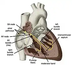 The cardiac conduction system (CCS) (also called the electrical conduction system of the heart)[1] transmits the signals generated by the sinoatrial node – the heart's pacemaker, to cause the heart muscle to contract, and pump blood through the body's circulatory system. The pacemaking signal travels through the right atrium to the atrioventricular node, along the bundle of His, and through the bundle branches to Purkinje fibers in the walls of the ventricles. The Purkinje fibers transmit the signals more rapidly to stimulate contraction of the ventricles.[2]