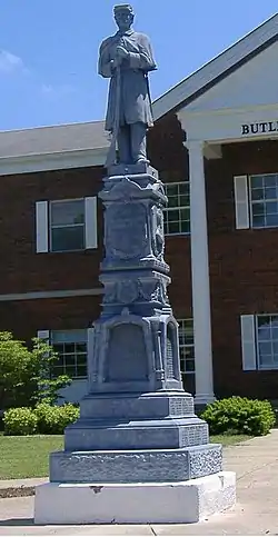 The monument was dedicated on May 30, 1907. It has a life-sized zinc statue of a Union soldier with kepi hat, winter great coat, and rifle. It stands atop a twelve-foot pedestal, making the entire monument eighteen feet in height. Depictions of Ulysses S. Grant, Abraham Lincoln, and Joseph Wheeler are placed on three sides of the pedestal. On the various sides of the pedestal are the names of several citizens of Butler County who fought on both sides, some of which died during the War and some that were still living when the monument was built in 1907. As a reflection of the joint effort made to build the statue, the monument refers to the conflict as the "War of 1861-5".[2][3]