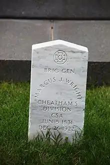 On June 5, 1899, Lewis and other Confederate veterans sent a petition to President McKinley asking that the Confederate dead at Arlington be disinterred and reburied in a "Confederate section". McKinley approved of the idea.[21] Former Confederate Brigadier General Marcus Joseph Wright (by 1898 an agent of the War Department collecting Confederate war records) drafted legislation to approve the reinterments, and Senator Joseph Roswell Hawley (a former brevet major general of volunteers for the Union) introduced it in Congress.[22] Congress approved the bill in 1900 and authorized $2,500 for the plan,[21] which specified that the reburials occur near the field where Spanish–American War dead had recently been interred.[22] McKinley signed the bill into law on June 6, 1900. A list of the dead at both Arlington and the Soldiers' Home was published so that families who wished to do so might remove their loved ones' remains from Arlington and reinter them closer to home.[21]