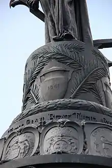 The topmost portion of the memorial consists of a larger-than-life figure of a woman representing the South.[47][142][131] The orientation of the figure and its face is toward the south, in part to honor the Confederacy[146][129][143] but also so that the sun may shine on the face of the figure at all times (which is symbolic of being favored).[133] The figure's head is crowned with an olive wreath,[47][143] which is both sacred to Minerva (Roman goddess of war and wisdom)[131] and a symbol of peace.[143] The figure's left hand extends a laurel wreath toward the south[47][142][146][131] in acknowledgment of the sacrifices made by the South's men in arms[47][143] and as a symbol of the past.[129] The figure holds a pruning hook in its right hand, which in turn rests on a plow.[47][142] This represents peace and reconciliation[47][142] as well as the hope that the labor of the South will lead to new glory.[131]