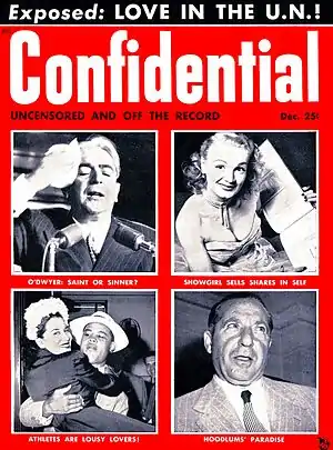 In 1947, Harrison "mocked up a 'fact' magazine called Eyewitness,"[7] which was never published. It would not be until 1952 that financial pressure forced Harrison to put serious effort in a new magazine. Harrison spent six months reworking the format of another factual magazine. He would later say: "I must have ripped that thing apart three times before I published it, and it still wasn't right."[9] Supposedly inspired by Virginia Hill's testimony to the Kefauver Committee hearings,[10] Harrison finally launched his tabloid-style gossip magazine: Confidential. "The name came from a series of exposé books by Lee Mortimer and Jack Lait."[11] As with the earlier New York Graphic, it concentrated on exposing the substance abuse habits, criminal records and hidden political and sexual preferences of celebrities. Though Harrison would publish non-show business stories involving "racketeering, consumer scams and politicians' peccadilloes," like Quigley Publishing that he previously worked for, the emphasis was Hollywood, but with a twist—"exposés of star secrets" became Confidential's prime focus.[12]
