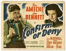 Confirm or Deny is a 1941 film made by 20th Century Fox, directed by Archie Mayo and Fritz Lang (uncredited), and starring Don Ameche and Joan Bennett. The screenplay was written by Jo Swerling, based on a story by Samuel Fuller and Henry Wales.