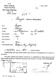 On 16 May 1915, while the Armenian genocide was underway, a secret directive was promulgated entitled "administrative instruction regarding movable and immovable property abandoned by Armenians deported as a result of the war and unusual political circumstances."[10][11][12][13][n 2] Once enacted, the directive established special commissions, known as the "Abandoned Property Commissions" (Turkish: Emvâl-i Metrûke İdare Komisyonları) and the "Liquidation Commissions" (Turkish: Tasfiye Komisyonu), which were tasked with providing detailed information and appraising the value of assets "abandoned" by deportees under the guise of "safeguarding" them.[10][8][14] The number of these commissions rose to 33 by January 1916.[15] After the departure of the deportees, goods and livestock that were deemed "perishable" were prioritized as the first items that must be sold using public auctions, while the profits from these auctions were to be safeguarded under the entitlement of the owners.[10] After providing documentation of the property (copies provided to the owners and the Ottoman Treasury), the directive specified that muhajirs (Turkish refugees mainly from the Balkan wars) were to be settled in the vacant lands and properties belonging to the deportees.[10][14] Once settled, the refugees had to register the land and houses, while other assets that were affixed to the property, such as olive groves and vineyards, were to be allocated amongst them. Unwanted items and assets were to be sold in public auctions.[10] According to historian Dickran Kouymjian, the settlement of muhajirs into the lands and properties of deported Armenians implies that local authorities had firsthand knowledge that the deportees were to never return.[14]