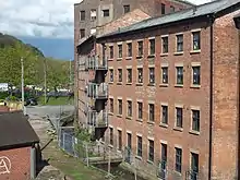 King Edward I granted permission to build a mill. Congleton became an important centre of textile production, especially leather gloves and lace.[4] Congleton had an early silk throwing mill, the Old Mill built by John Clayton and Nathaniel Pattison in 1753.[10] More mills followed, and cotton was also spun. The town's prosperity depended on tariffs imposed on imported silk. When tariffs were removed in the 1860s, the empty mills were converted to fustian cutting. A limited silk ribbon weaving industry survived into the 20th century, and woven labels were still produced in the 1990s. Many mills survive as industrial or residential units.[11]