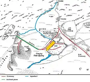 The adits were about 60 feet (18 m) apart vertically, according to Horswill, who wrote to the Mining Journal in 1874.[15] The upper levels are around 1,425 feet (434 m) above sea level,[16] whereas the mill is just below the 1,120-foot (340 m) contour.[8] A double-track inclined plane connected the level 'C' adit to the mill level, although wagons from level 'B' could also use it. Most of it was at an angle of 30 degrees, but it became shallower at the bottom. It was worked by gravity, with full wagons running down it raising empty wagons on the other track.[17] Three tracks entered the mill, and additional tracks to the south carried rubbish onto tips.[18] The mill was powered by a 30-foot (9.1 m) waterwheel, which was 4 feet (1.2 m) wide.[19] Water was brought down the hillside in leats fed by several streams, and there were two sections of raised aqueduct or launder. Several of the slate pillars which supported the final launder to the wheel pit are still in situ.[20]
