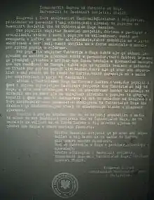 The Congress of Përmet, was a meeting of the Albanian communist leaders on May 24, 1944, in Përmet, Albania, which elected a Provisional Government. The congress was modeled after the Anti-Fascist Council for the National Liberation of Yugoslavia.[1] 188 delegates attended the Congress. The majority of the delegates came from Southern and Central Albania: 25 from Korça, 48 from Vlora-Gjirokastra, 15 from Berat, 8 from Elbasan, 10 from Tirana, 3 from Peza, 2 from Durrës. Additionally, the congress was attended by delegates of the National Liberation Movement and the Brigades.