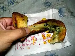 Cong you bing (cōngyóubǐng)[1] (simplified Chinese: 葱油饼; traditional Chinese: 蔥油餅; pinyin: cōngyóubǐng; Wade–Giles: Ts'ung1-yu2-ping3; lit. 'scallion oil pancake'; Mandarin pronunciation [tsʰʊ́ŋjǒʊpìŋ]), also known as scallion pancake or "green onion pancake", is a Chinese savory, unleavened flatbread folded with oil and minced scallions (green onions). Unlike Western pancakes, it is made from dough instead of batter. It is pan-fried, which gives it crisp edges and a chewy texture. Many layers make up the interior, contributing to its chewy texture.[2] Variations exist on the basic method of preparation that incorporate other flavors and fillings.