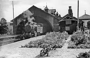 There was a single track engine shed and a 42 feet (13 m) turntable south east of the station building.[23][24] The shed was re-roofed by British Railways[25] then closed when the station closed to passengers in 1958, but remained standing until the line and station were demolished in the 1960s.[26]