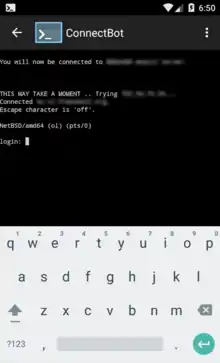 ConnectBot is an open-source Secure Shell client for the Android operating system. It lets users securely log in remotely to servers that run a secure shell daemon. This allows the user to enter commands from their Android device and have the commands run on the remote server instead of the local android device. It uses the standard encryption used by SSH2 to keep any commands and data that are transmitted from being eavesdropped by any potential listeners across the network.