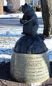 Connect is an anthropomorphic bronze sculpture depicting a life-sized raccoon holding a fish with its two hands. One of its back feet is raised. While the animal's fur, tail and head closely mimic a raccoon's actual features, its feet, forearms and hands have a human quality. The base on which the raccoon sits is embossed with woodland imagery like trees, insects and a salamander.