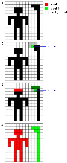 - If this pixel is a foreground pixel and it is not already labelled, give it the current label and add it as the first element in a queue, then go to (3). If it is a background pixel or it was already labelled, then repeat (2) for the next pixel in the image.