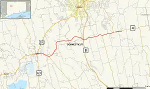 Route 118 begins at the corner of South Street and East Street in the Litchfield green at the center of the borough at an intersection with Route 63. It heads east as the southern branch of East Street, crosses the Bantam River, then intersects with Route 254 (the road to the village of Northfield). Route 118 then enters the village of East Litchfield, where there is a junction with Thomaston Road, an old alignment of Route 8 before the expressway was built. It then crosses the Naugatuck River into the town of Harwinton where it immediately has a junction with Route 8 (exit 42). Within Harwinton, Route 118 is known as Litchfield Road. Route 118 continues for another 2.6 miles (4.2 km) as it heads towards Harwinton center, where it ends at the junction with Route 4. Litchfield Road continues beyond Harwinton center as Route 4.[1]