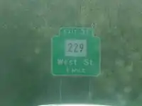 Route 229 nominally begins at the end of the eastbound Exit 31 off-ramp of I-84 in western Southington, heading northward along West Street.[2] State maintenance and the official southern end of Route 229 actually begins about 0.01-mile (0.016 km) south of the off-ramp.[1] West Street is four lanes wide in the vicinity of the I-84 interchange, then becomes a 3 lane (2 lanes northbound, 1 lane southbound) urban arterial as it heads north. Just south of the Bristol town line, Route 229 shifts to Middle Street and the road becomes four lanes wide.[1][2]