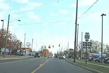 Approximately four miles (6.4 km) east of that junction, M-34 turns north for about two miles (3.2 km) along Benner Highway and passes through the community of Cadmus. At the end of its course along Benner Highway, M-34 turns east towards Adrian on Beecher Road. There are some residential subdivisions along the road on the southwest side of Adrian. M-34 intersects Industrial Drive and crosses US 223 and Beecher Road becomes Beecher Street in town. The trunkline continues east and terminates at the intersection of Beecher and Main streets where it meets BUS US 223/M-52.[3][4]