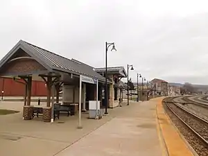 The current station is the third station placed here. It was constructed during the winter of 2010-11 and cost $1.25 million.[2] Built primarily of dark red brick, the structure has an enclosed, one-story waiting room with large windows. From the outside, the waiting room is marked by projecting bays whose surfaces are covered in a rock-faced, coursed ashlar in a light beige tone. Developed by d+A design+Architecture of Yardley, Pennsylvania, the station design draws inspiration from historic late 19th and early 20th century depots found in small towns across the nation. It is similar to stations Amtrak has built in Okeechobee, Florida, Winnemucca, Nevada and Alliance, Ohio. In addition to the shelter, Amtrak installed a 550-foot concrete platform, signage and light poles. The new station is in the vicinity of the former Baltimore & Ohio Railroad station, which no longer stands.[3]