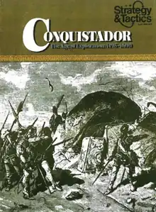 The game was designed by Richard Berg, with assistance from Greg Costikyan, with artwork and graphic design by Redmond A. Simonsen. It was first published by SPI as a pull-out game in Issue 58 of Strategy & Tactics, and then released as a boxed set. Although it generated steady sales,[2] it was not a bestseller for SPI, never making into their Top Ten list.[3] As assistant designer Greg Costikyan noted in 1985, "When Conquistador was first published, it met with a mixed reception on the part of [Strategy & Tactics] subscribers, primarily, I think, because S&T subscribers preferred hard World War II military games, and Conquistador was rather anomalous from their point of view."[2]