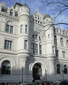 Much of the original appropriation for the building was allotted for the purchase of the lot, which is bounded by Cadman Plaza East (then Washington Street),[2] Johnson, Adams, and Tillary streets. After Bell's resignation, his design was revised by his successor, William A. Freret, whose final design was a much bolder Romanesque building than Bell had envisioned.[5] Still, some of the more elaborate architectural details of Bell's original design, such as larger corner towers, were never executed in the final design.