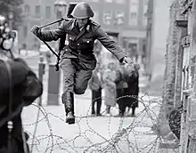 ![]() Konrad Schumann leaping over barbed wire into West Berlin on 15 August 1961. | |