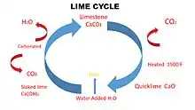 Calcium carbonate (limestone) is decomposed by heat to produce calcium oxide (quicklime) and carbon dioxide gas. Then calcium oxide reacts with water to form calcium hydroxide (slaked lime) which is accompanied by the release of heat, a reaction known as exothermic.[1]
