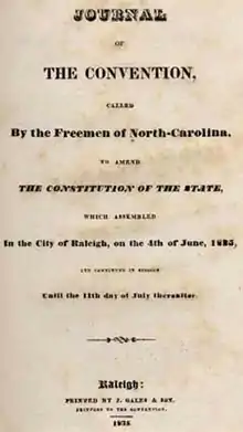 - Jeffrey, Thomas E. (1996). "1835 Constitutional Convention". NCPedia. Retrieved September 23, 2019.