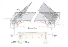 The United States Commission of Fine Arts (CFA) had legal authority to approve the design and architectural style of the bridge. However, the United States Army Corps of Engineers had legal authority over the construction of public works in the District of Columbia. These two bodies agreed in late 1923 to construct a nine-span, 2,138-foot (652 m) long drawbridge made of steel and reinforced concrete faced in white granite.[12] The bridge required four abutments, one on each shoreline and one on either side of the draw (or bascule) span.[13] The abutments had to be erected on bedrock.[12] The bridge was relatively low to the water,[14] which meant the roadway would be only 43 feet (13 m)[12] and the underside of each span just 10 feet (3.0 m) above the low-water mark.[15] The spans in the bridge sloped downward 12 feet (3.7 m), and all engines, gears, lookout stations, bridge tenders' houses, and other drawbridge equipment were as far out of sight below deck as possible.[12] The spans varied in width from 166 feet (51 m) near the shore to 184 feet (56 m) at the draw span. The roadway was 60 feet (18 m) in width, and sidewalks (each 15 feet (4.6 m) in width) ran down each side of the bridge.[13][16][17] A balustrade, 4,276 feet (1,303 m) long, was also planned. The balustrade was solid over the piers and abutments but turned spindles over the spans to permit maximum views of the river by motorists using the bridge.[18]