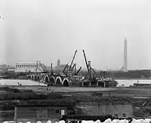 Work on the bridge began on the D.C. side, moving toward Virginia. By June 30, steel sheets were driven into the riverbottom to allow construction of the cofferdams for Abutment No. 1, Pier No. 1, and Pier No. 2, and excavation was under way on Abutment No. 1 and Pier No. 1.[15] The first load of granite (from Stone Mountain) arrived on July 31.[69] To accommodate the immense quantities of stone being used, the AMBC contracted with the G.B. Mullin Co. to build a stoneyard on the Virginia shoreline. The Rosslyn Connecting Railroad built a spur from the Rosslyn Branch of the Pennsylvania Railroad to the stoneyard.[15] A 40-short-ton (36 t) crane, on loan from the War Department and mounted on a railroad car, was used to unload and handle granite in the stoneyard, and another 3,500 feet (1,100 m) of siding constructed in the yard to maneuver railroad cars about.[31]