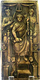 The routine distribution of such diptychs in the East is marked by a decision by Theodosius I in 384 to limit expenditure on the games of Constantinople by reserving ivory diptychs (and golden gifts) to consuls alone.[4] In the western empire, they became a usual part of the public displays given by great aristocrats. Quintus Aurelius Symmachus, for example, distributed some to commemorate his son's quaestorian games in 393 and praetorian games in 401 respectively. Almost all depict the games, and on three separate occasions Symmachus links the presentation of these diptychs with the completion of the games.[5] Their end is marked by the consulship's disappearance under the reign of Justinian in 541.