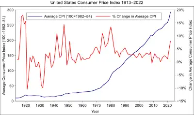 A graph of the US CPI from 1913 (in blue), and its percentage annual change (in red)
