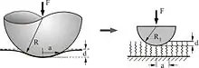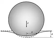 An elastic sphere of radius indents an elastic half-space where total deformation is , causing a contact area of radius