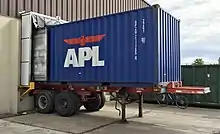 A container is lifted onto a chassis by a specialized crane, ensuring that the container's corner castings line up with the chassis’ twistlocks (pins). The container is locked to the chassis by engaging the pins.[2] The length of a chassis determines which container length it can accept. For example, a 40-foot-long chassis is used for a 40-foot-long container. Some chassis can be extended or shortened depending on which container needs to be hauled.[3]