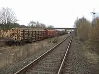 For the transport of logs, four-axle wagons with non-drivable decks and equipped with high, fixed stanchions are used (Class Snps).