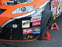 The best known example of a series with many contingency sponsorships was the NASCAR Cup Series. The front fenders of the cars were mottled with rectangular decals that teams are either required or financially encouraged to display.[1] Some of the more lucrative contingencies are the Busch Pole Award and the Sunoco Rookie of the Year Award.[1] In 2018, NASCAR moved away contingency sponsorship stickers in the cars, instead granting such sponsors online sponsorship assets.[3]