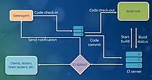 In software engineering, continuous integration (CI) is the practice of merging all developers' working copies to a shared mainline several times a day.[1] Nowadays it is typically implemented in such a way that it triggers an automated build with testing. Grady Booch first proposed the term CI in his 1991 method,[2] although he did not advocate integrating several times a day. Extreme programming (XP) adopted the concept of CI and did advocate integrating more than once per day – perhaps as many as tens of times per day.[3]