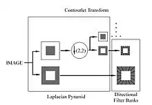 The contourlet transform uses a double filter bank structure to get the smooth contours of images. In this double filter bank, the Laplacian pyramid (LP) is first used to capture the point discontinuities, and then a directional filter bank (DFB) is used to form those point discontinuities into linear structures.[2]